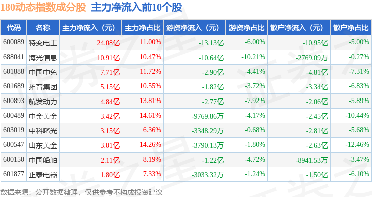 资金流向方面,180动态(000123)指数成份股当日主力资金净流出合计26.91亿元,游资资金净流出合计5.21亿元,散户资金净流入合计32.12亿元。成份股资金流向详情见下表: