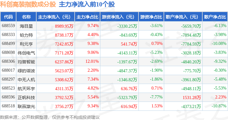 资金流向方面,科创高装(000687)指数成份股当日主力资金净流入合计5405.18万元,游资资金净流入合计2.31亿元,散户资金净流出合计2.85亿元。成份股资金流向详情见下表: