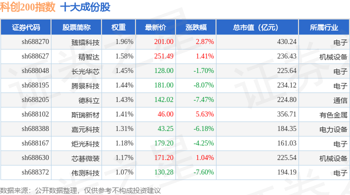 证券之星消息,1月19日,科创200(000699)指数报收于1537.99点,涨0.03%,成交837.03亿元,换手率3.67%。当日该指数成份股中,上涨的有91家,航亚科技以15.01%的涨幅领涨,下跌的有108家,腾景科技以8.07%的跌幅领跌。