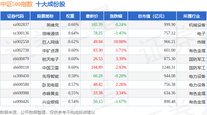 中证500(000905)指数十大成份股详情如下: