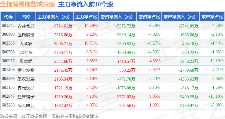 资金流向方面,全指消费(000990)指数成份股当日主力资金净流出合计6.87亿元,游资资金净流入合计6.07亿元,散户资金净流入合计7948.47万元。成份股资金流向详情见下表: