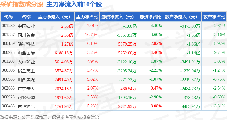 资金流向方面,采矿指数(399232)成份股当日主力资金净流入合计3.21亿元,游资资金净流出合计4286.91万元,散户资金净流出合计2.78亿元。成份股资金流向详情见下表: