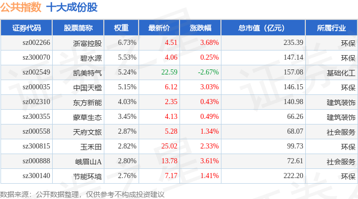 证券之星消息,1月19日,公共指数(399244)报收于655.7点,涨2.09%,成交99.32亿元,换手率2.71%。当日该指数成份股中,上涨的有49家,山高环能以10.06%的涨幅领涨,下跌的有4家,艾可蓝以5.86%的跌幅领跌。