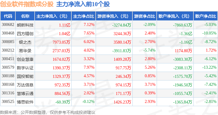 资金流向方面,创业软件(399264)指数成份股当日主力资金净流出合计49.91亿元,游资资金净流入合计12.05亿元,散户资金净流入合计37.85亿元。成份股资金流向详情见下表: