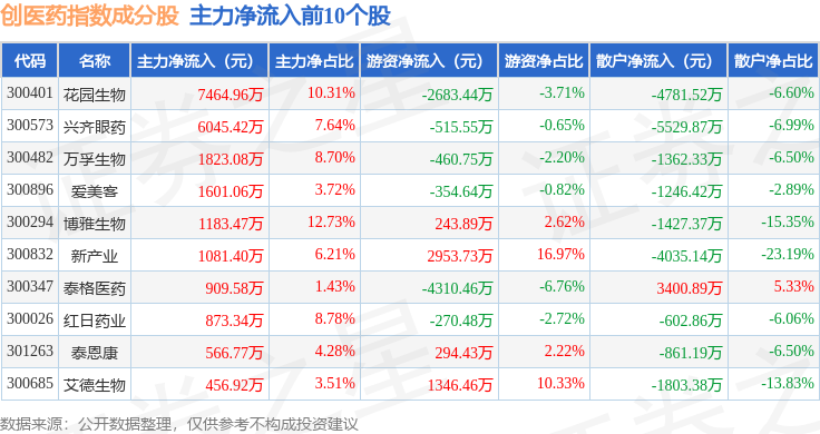 资金流向方面,创医药(399275)指数成份股当日主力资金净流出合计12.46亿元,游资资金净流入合计4.1亿元,散户资金净流入合计8.36亿元。成份股资金流向详情见下表: