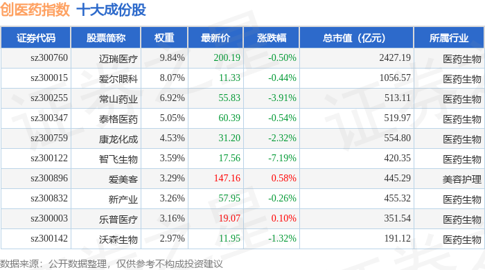 创医药(399275)指数十大成份股详情如下: