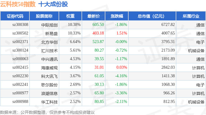 云科技50(399279)指数十大成份股详情如下:
