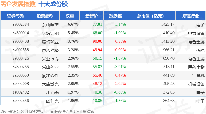 民企发展(399292)指数十大成份股详情如下:
