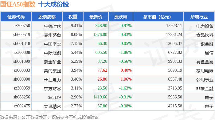 资金流向方面,国证A50(399310)指数成份股当日主力资金净流出合计57.81亿元,游资资金净流出合计5.06亿元,散户资金净流入合计62.86亿元。成份股资金流向详情见下表: