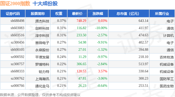 国证2000(399303)指数十大成份股详情如下: