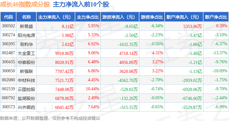 资金流向方面,成长40(399326)指数成份股当日主力资金净流出合计20.83亿元,游资资金净流入合计1.22亿元,散户资金净流入合计19.6亿元。成份股资金流向详情见下表:
