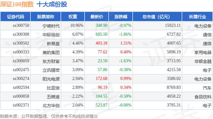 深证100(399330)指数十大成份股详情如下: