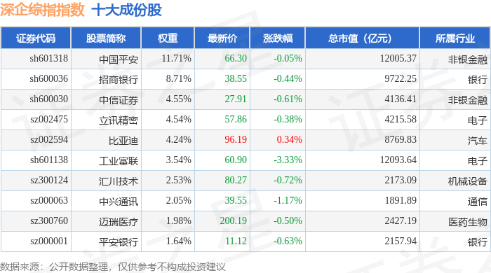 深企综指(399352)指数十大成份股详情如下: