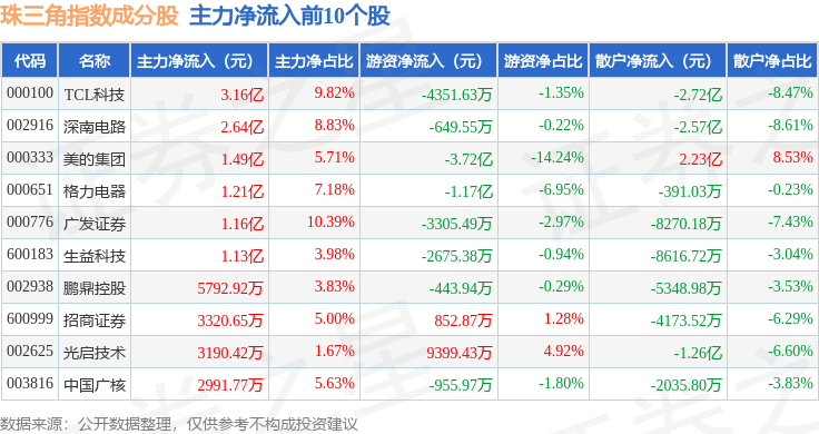 资金流向方面,珠三角(399356)指数成份股当日主力资金净流出合计34.1亿元,游资资金净流入合计3211.29万元,散户资金净流入合计33.78亿元。成份股资金流向详情见下表: