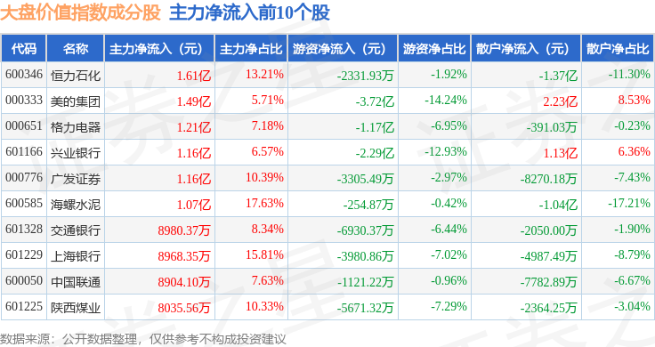 资金流向方面,大盘价值(399373)指数成份股当日主力资金净流出合计9.75亿元,游资资金净流出合计2.6亿元,散户资金净流入合计12.35亿元。成份股资金流向详情见下表: