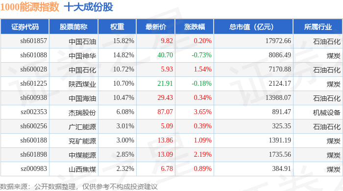 1000能源(399381)指数十大成份股详情如下: