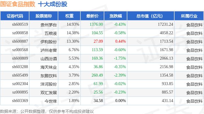 证券之星消息,1月19日,国证食品(399396)指数报收于17445.25点,涨0.08%,成交227.91亿元,换手率0.86%。当日该指数成份股中,上涨的有38家,安德利以5.77%的涨幅领涨,下跌的有11家,东鹏饮料以2.39%的跌幅领跌。