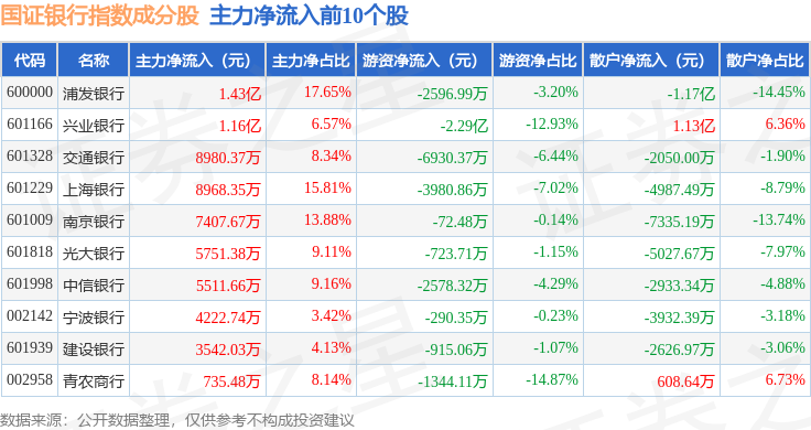 资金流向方面,国证银行(399431)指数成份股当日主力资金净流出合计7.62亿元,游资资金净流出合计2.16亿元,散户资金净流入合计9.78亿元。成份股资金流向详情见下表: