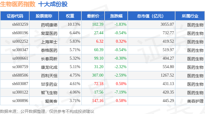 证券之星消息,1月19日,生物医药(399441)指数报收于2273.19点,跌1.11%,成交151.04亿元,换手率1.17%。当日该指数成份股中,上涨的有8家,通化东宝以1.41%的涨幅领涨,下跌的有21家,智飞生物以7.19%的跌幅领跌。