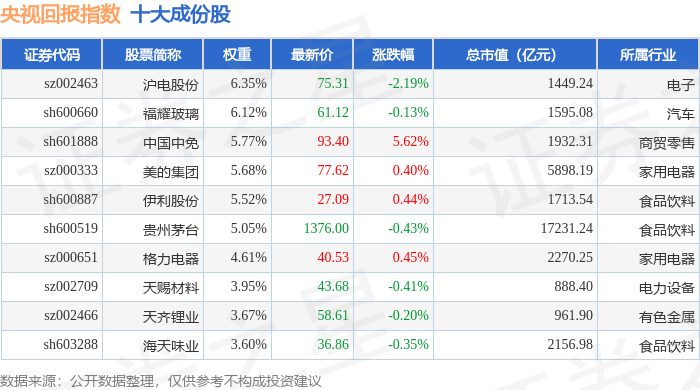 央视回报(399553)指数十大成份股详情如下: