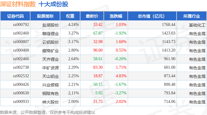 深证材料(399614)指数十大成份股详情如下: