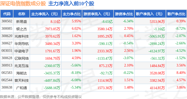 资金流向方面,深证电信(399621)指数成份股当日主力资金净流出合计30.49亿元,游资资金净流入合计12.61亿元,散户资金净流入合计17.89亿元。成份股资金流向详情见下表:
