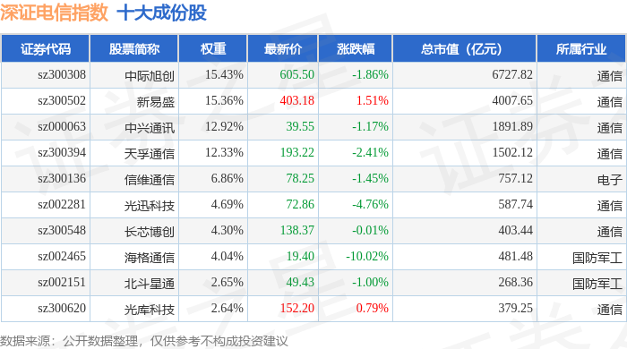 深证电信(399621)指数十大成份股详情如下: