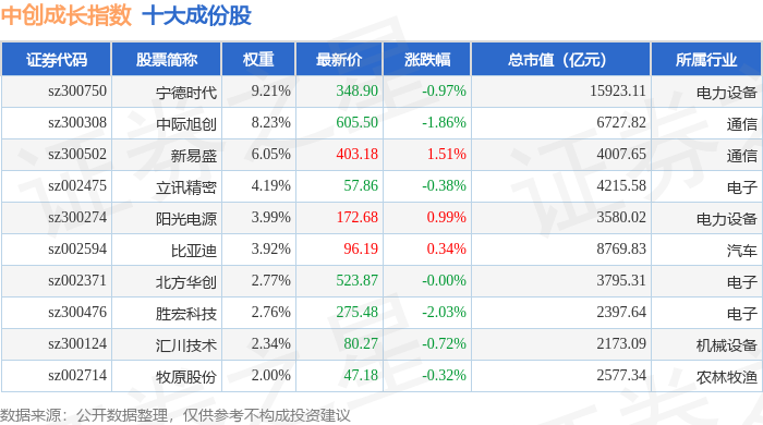 中创成长(399626)指数十大成份股详情如下:
