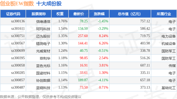 证券之星消息,1月19日,创业板EW(399635)指数报收于2418.99点,跌0.56%,成交2465.91亿元,换手率3.41%。当日该指数成份股中,上涨的有38家,迈为股份以8.24%的涨幅领涨,下跌的有61家,锐捷网络以12.14%的跌幅领跌。