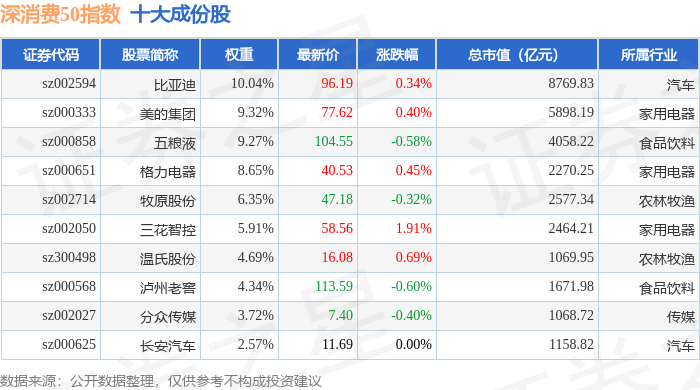 深消费50(399646)指数十大成份股详情如下: