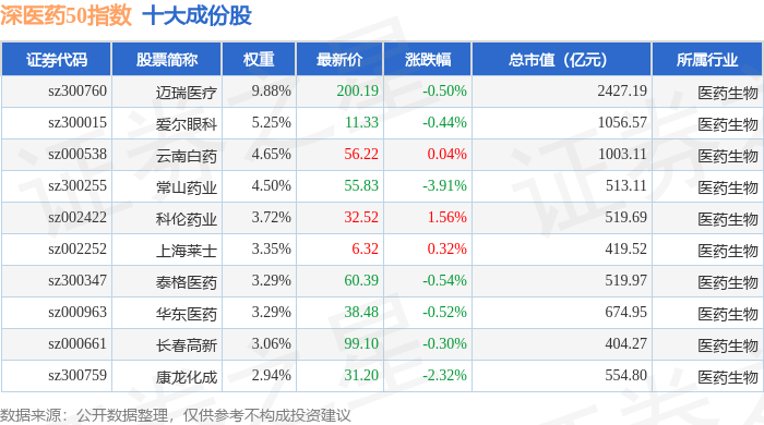 深医药50(399647)指数十大成份股详情如下: