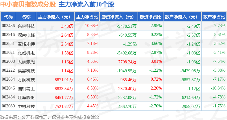 资金流向方面,中小高贝(399664)指数成份股当日主力资金净流出合计61.17亿元,游资资金净流入合计8.5亿元,散户资金净流入合计52.68亿元。成份股资金流向详情见下表: