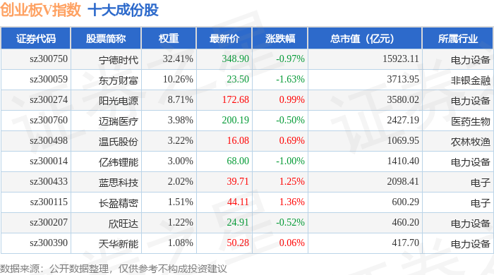 创业板V(399668)指数十大成份股详情如下: