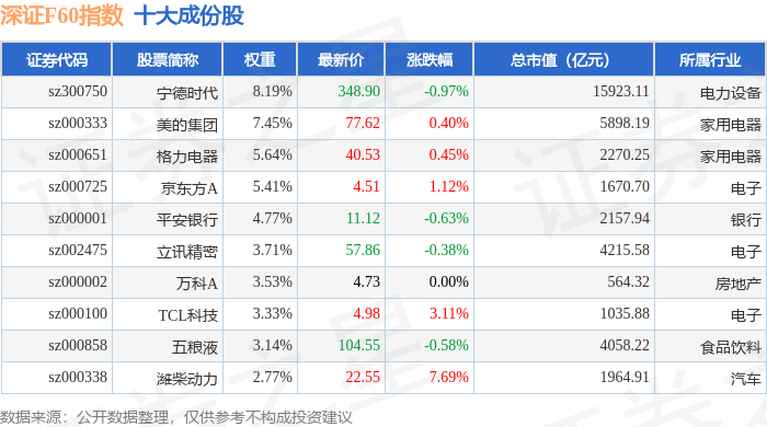 证券之星消息,1月19日,深证F60(399701)指数报收于8093.1点,涨0.41%,成交975.57亿元,换手率1.21%。当日该指数成份股中,上涨的有36家,潍柴动力以7.69%的涨幅领涨,下跌的有22家,智飞生物以7.19%的跌幅领跌。