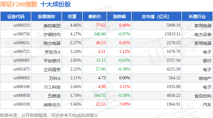 证券之星消息,1月19日,深证F200(399703)指数报收于7837.58点,涨0.64%,成交2875.71亿元,换手率1.6%。当日该指数成份股中,上涨的有130家,越秀资本以10.0%的涨幅领涨,下跌的有63家,智飞生物以7.19%的跌幅领跌。