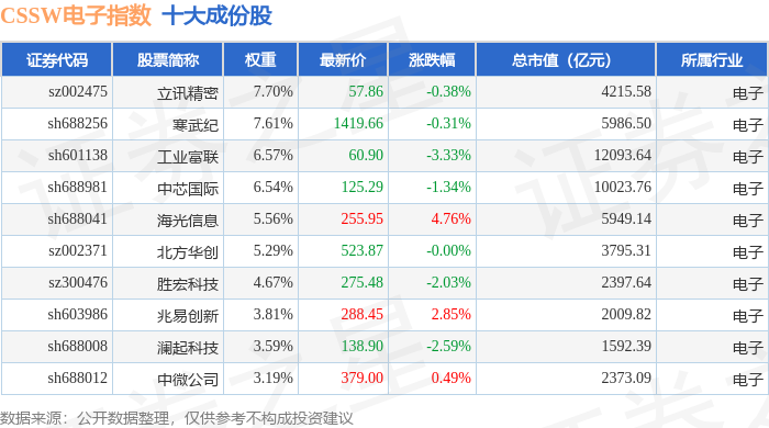 证券之星消息,1月19日,CSSW电子(399811)指数报收于6275.82点,跌0.41%,成交1969.1亿元,换手率3.09%。当日该指数成份股中,上涨的有23家,盛科通信以8.74%的涨幅领涨,下跌的有37家,汉朔科技以9.41%的跌幅领跌。