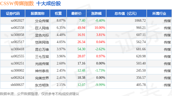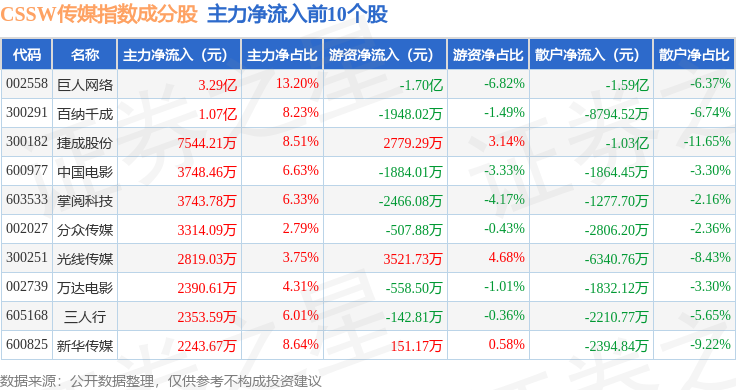 资金流向方面,CSSW传媒(399810)指数成份股当日主力资金净流出合计43.21亿元,游资资金净流入合计16.31亿元,散户资金净流入合计26.9亿元。成份股资金流向详情见下表: