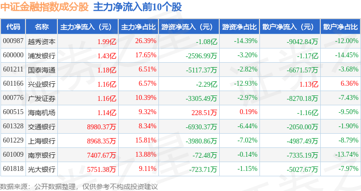 资金流向方面,中证金融(399934)指数成份股当日主力资金净流出合计26.92亿元,游资资金净流入合计3.23亿元,散户资金净流入合计23.69亿元。成份股资金流向详情见下表: