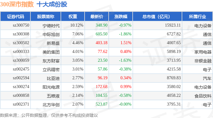 300深市(399972)指数十大成份股详情如下: