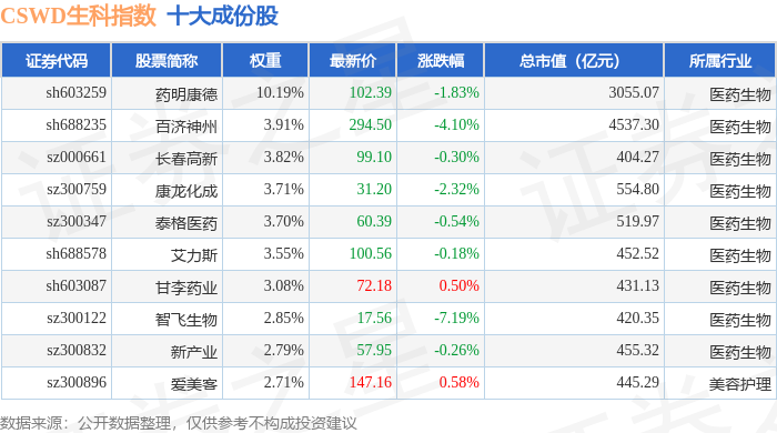 CSWD生科(399993)指数十大成份股详情如下: