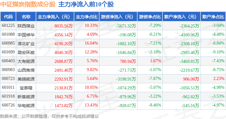 资金流向方面,中证煤炭(399998)指数成份股当日主力资金净流入合计1.88亿元,游资资金净流出合计1.48亿元,散户资金净流出合计3963.44万元。成份股资金流向详情见下表: