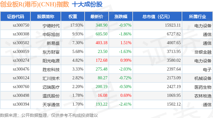 创业板R(港币)(CNH)(470006)指数十大成份股详情如下: