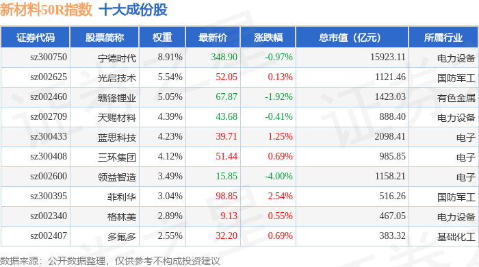 证券之星消息,1月19日,新材料50R(470042)指数报收于4563.72点,涨0.34%,成交888.85亿元,换手率3.25%。当日该指数成份股中,上涨的有32家,中钨高新以7.36%的涨幅领涨,下跌的有18家,沃尔核材以4.56%的跌幅领跌。