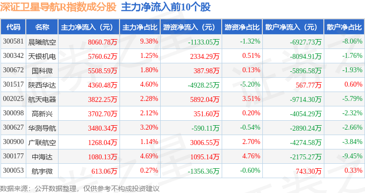 资金流向方面,深证卫星导航R(470050)指数成份股当日主力资金净流出合计42.5亿元,游资资金净流入合计11.81亿元,散户资金净流入合计30.69亿元。成份股资金流向详情见下表: