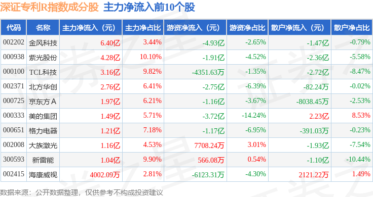 资金流向方面,深证专利R(470067)指数成份股当日主力资金净流出合计39.29亿元,游资资金净流出合计4.83亿元,散户资金净流入合计44.12亿元。成份股资金流向详情见下表: