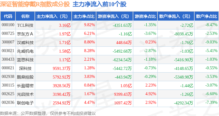 资金流向方面,深证智能穿戴R(470074)指数成份股当日主力资金净流出合计33.72亿元,游资资金净流入合计6.04亿元,散户资金净流入合计27.68亿元。成份股资金流向详情见下表: