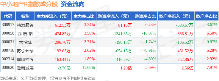 资金流向方面,中小地产R(471002)指数成份股当日主力资金净流出合计3.58亿元,游资资金净流入合计9433.38万元,散户资金净流入合计2.64亿元。成份股资金流向详情见下表: