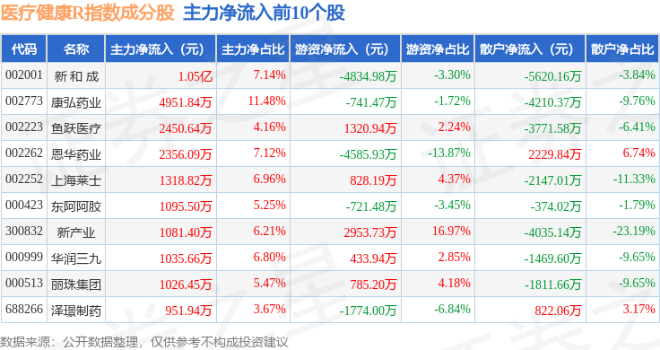 资金流向方面,医疗健康R(480016)指数成份股当日主力资金净流出合计14.29亿元,游资资金净流入合计2.62亿元,散户资金净流入合计11.67亿元。成份股资金流向详情见下表: