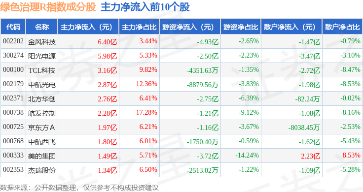 资金流向方面,绿色治理R(480058)指数成份股当日主力资金净流出合计31.6亿元,游资资金净流出合计5.39亿元,散户资金净流入合计36.99亿元。成份股资金流向详情见下表: