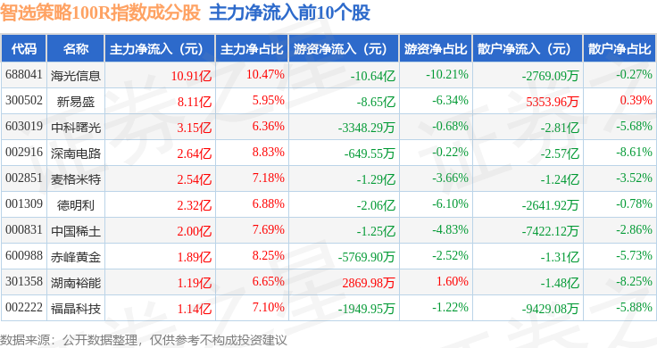资金流向方面,智选策略100R(489015)指数成份股当日主力资金净流出合计111.09亿元,游资资金净流入合计36.02亿元,散户资金净流入合计75.07亿元。成份股资金流向详情见下表: